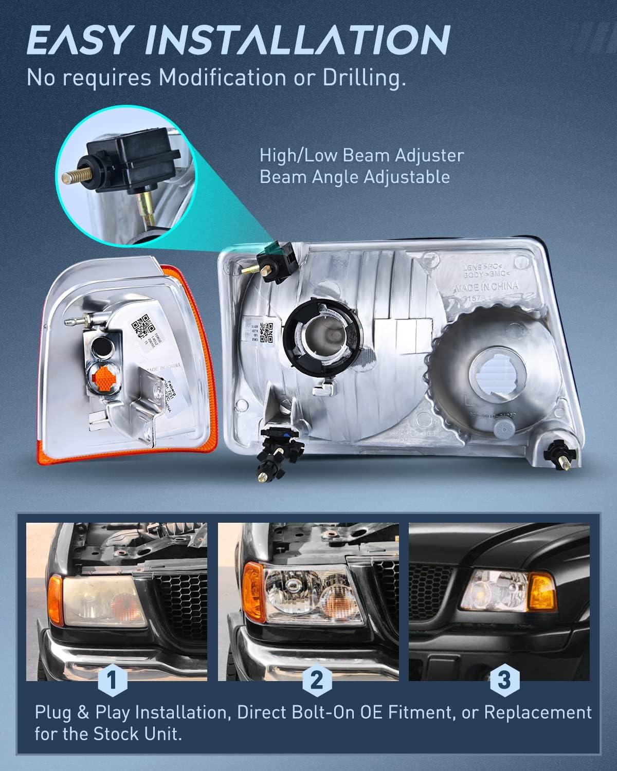 DOT Compliance and safe Driving: To ensure driving safety for you and the oncoming driving circumstance, our 2001 2002 2003 2004 2005 2006 2007 2008 2009 2010 2011 Ford Ranger headlights are DOT & SAE compliant. Our headlights provides clearer and further vision to see the wild animals, falling rocks or other obstacles at night. Reduce the possibility of danger.