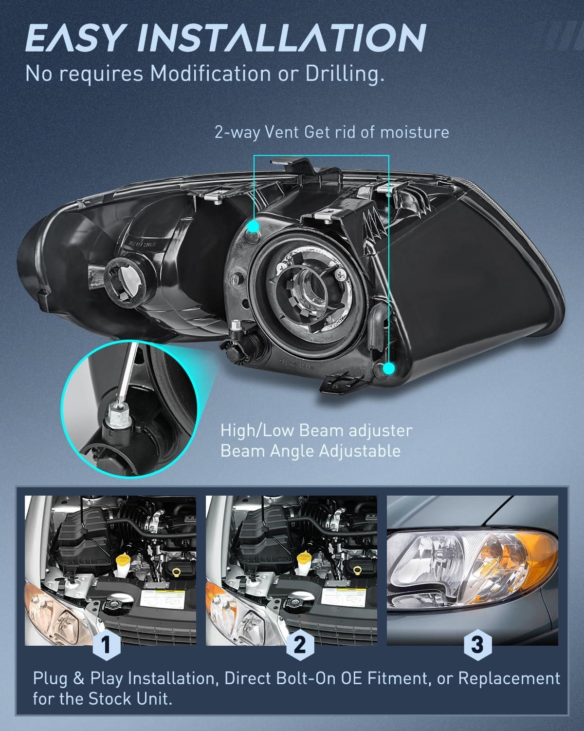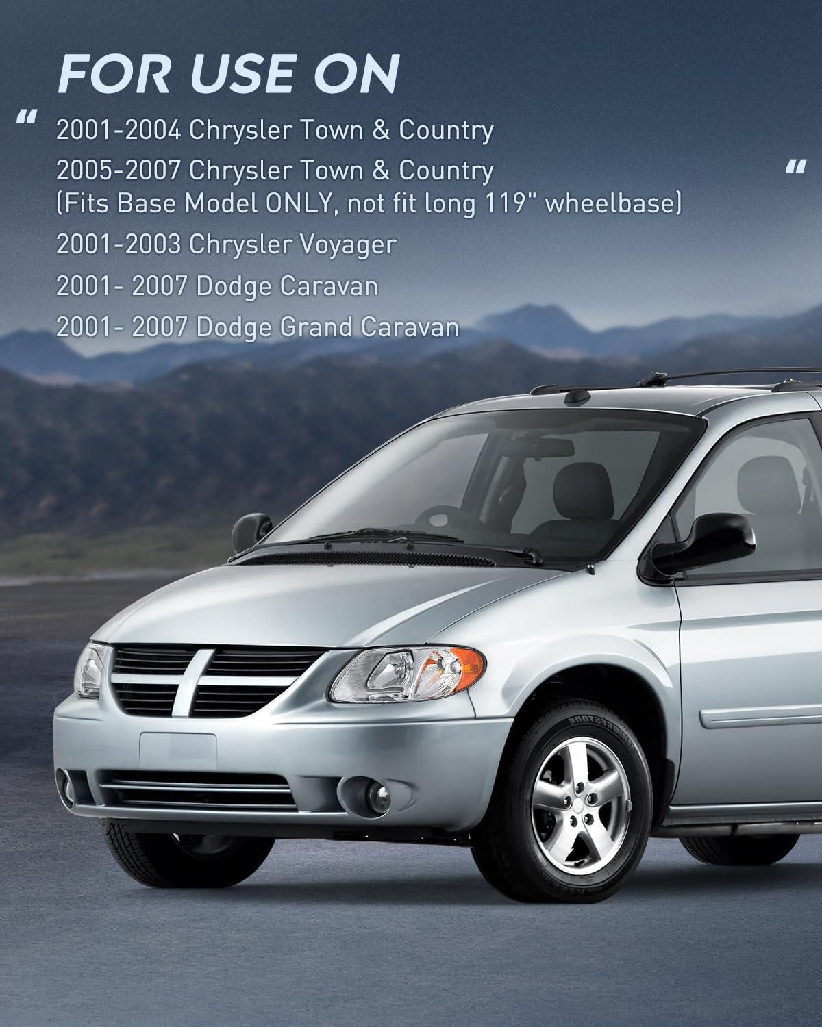 DOT Compliance and safe Driving: To ensure driving safety for you and the oncoming driving circumstance, our 2001 2002 2003 2004 Chrysler Town & Country 2005 2006 2007 Chrysler Town & Country (Fits Base Model ONLY, not fit long 119″ wheelbase) 2001 2002 2003 Chrysler Voyager 2001 2002 2003 2004 2005 2006 2007 Dodge Caravan 2001 2002 2003 2004 2005 2006 2007 Dodge Grand Caravan headlights are DOT & SAE compliant. Our headlights provides clearer and further vision to see the wild animals, falling rocks or other obstacles at night. Reduce the possibility of danger.