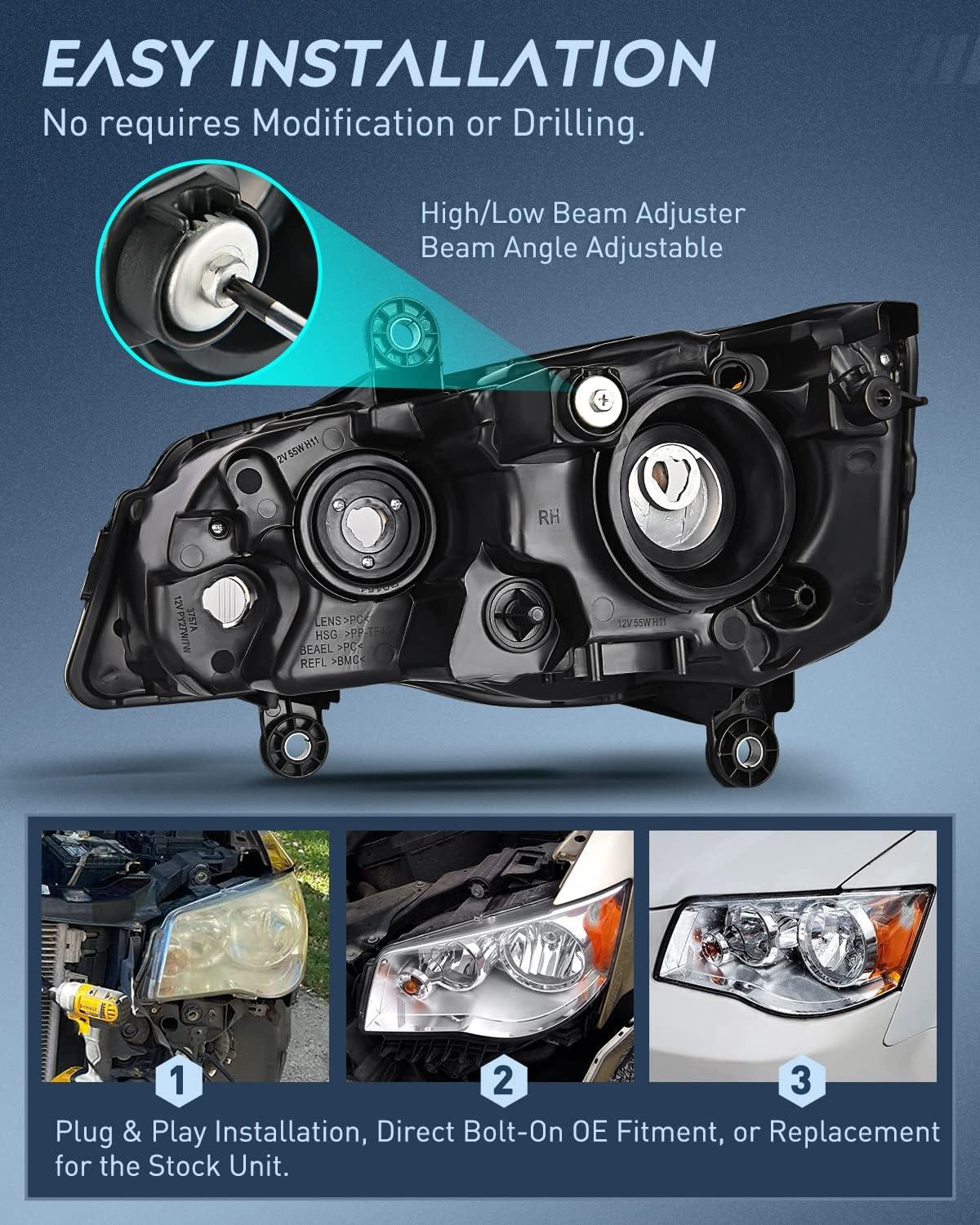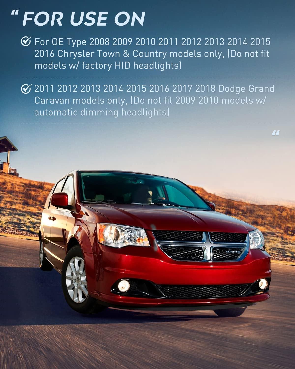 DOT Compliance and safe Driving: To ensure driving safety for you and the oncoming driving circumstance, our 2011-2018 Dodge Grand Caravan 2008-2016 Chrysler Town & Country headlights are DOT & SAE compliant. Our headlights provides clearer and further vision to see the wild animals, falling rocks or other obstacles at night. Reduce the possibility of danger.