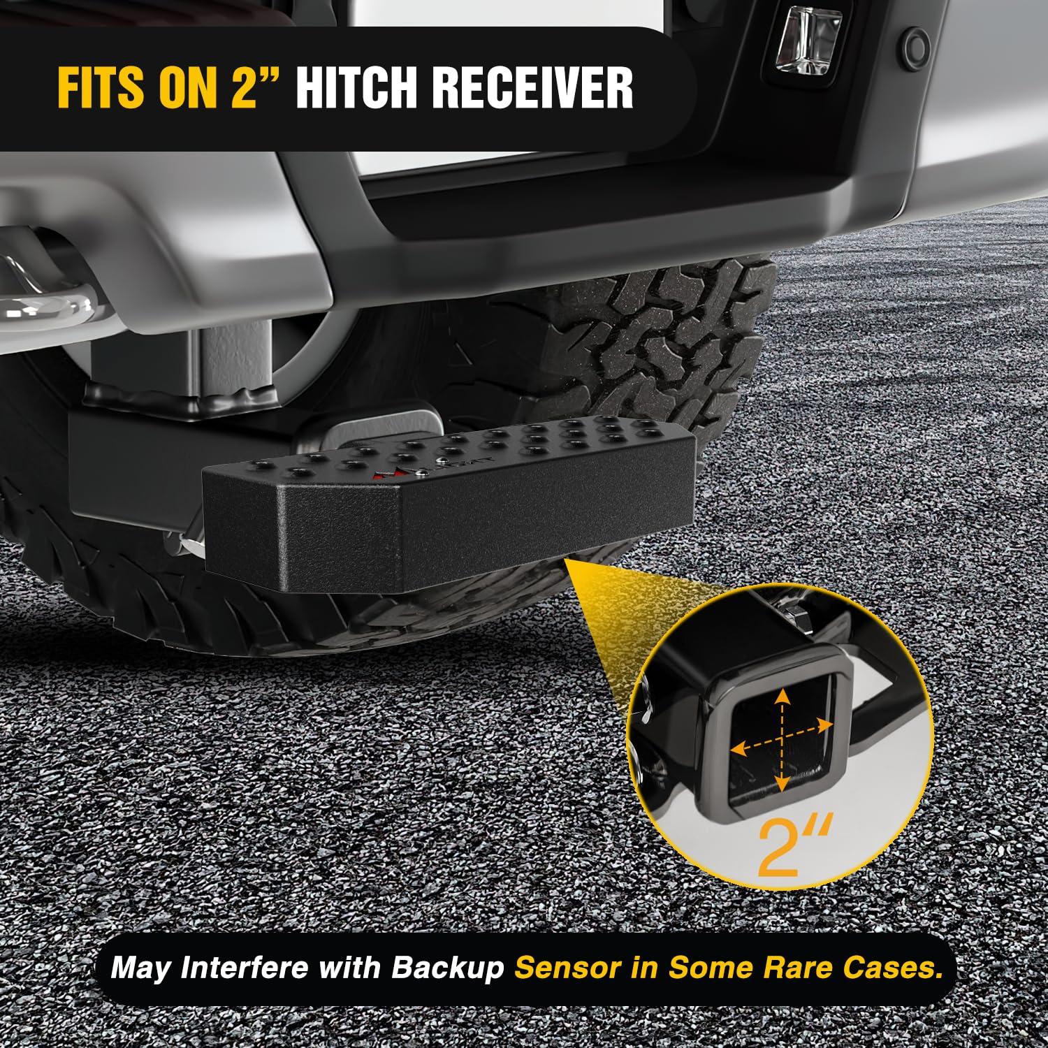 Nilight Hitch Step Fits for Truck Vehicles with 2 inch Hitch Receiver Fits: Car/Truck/Vehicles with 2 inch Hitch Receiver. Color: Textured black Materials: Manufactured from 5/32″ steel sheets and 2″X0.120″ steel tubing 1 x Hitch Step 1 x Hitch Lock 1 x U-Bolts Stabilizer 1 x Set of Screws 1 x DIY Installation Manual
