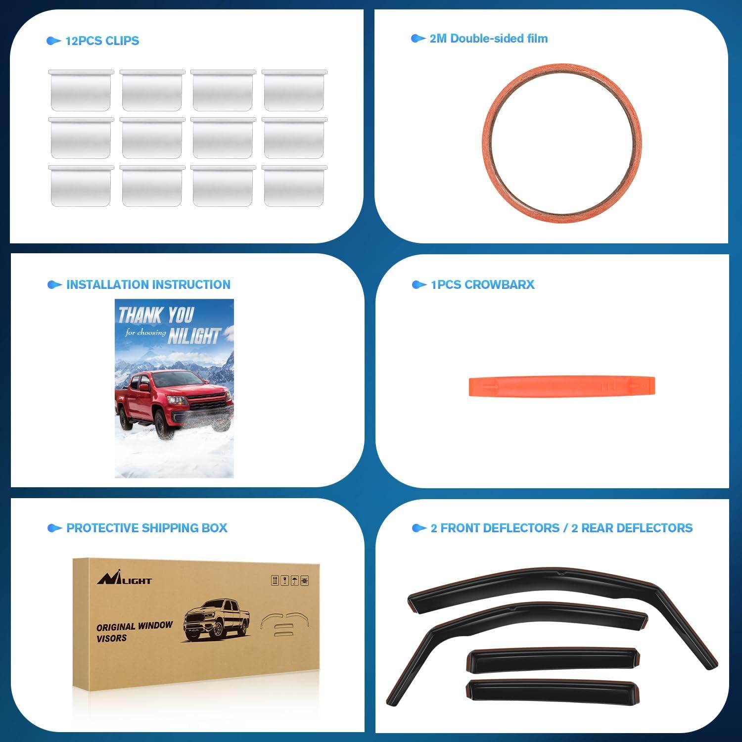 PACKAGE INCLUDED:4 PCS Rain Guards,12pcs clips,Crowbar 1pcs,78inch double-sided tape and installation instruction