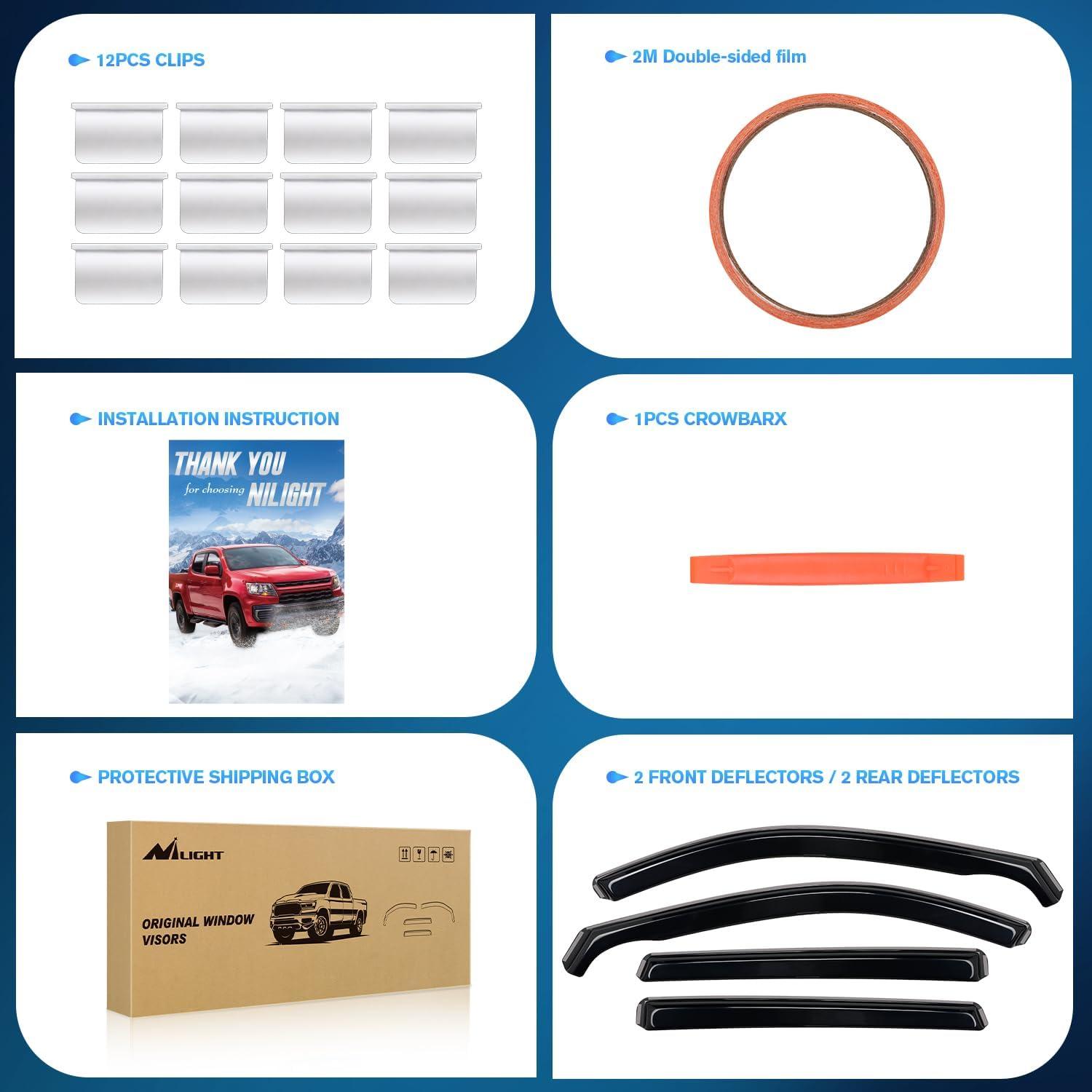 Advantage:Nilight window deflectors are great for all weather conditions,help improve ventilation inside and outside your car to reduce mirror and window fogging while increasing air circulation。With our side window deflectors, it deflects the rain and noise away from your windows to make your driving more enjoyable