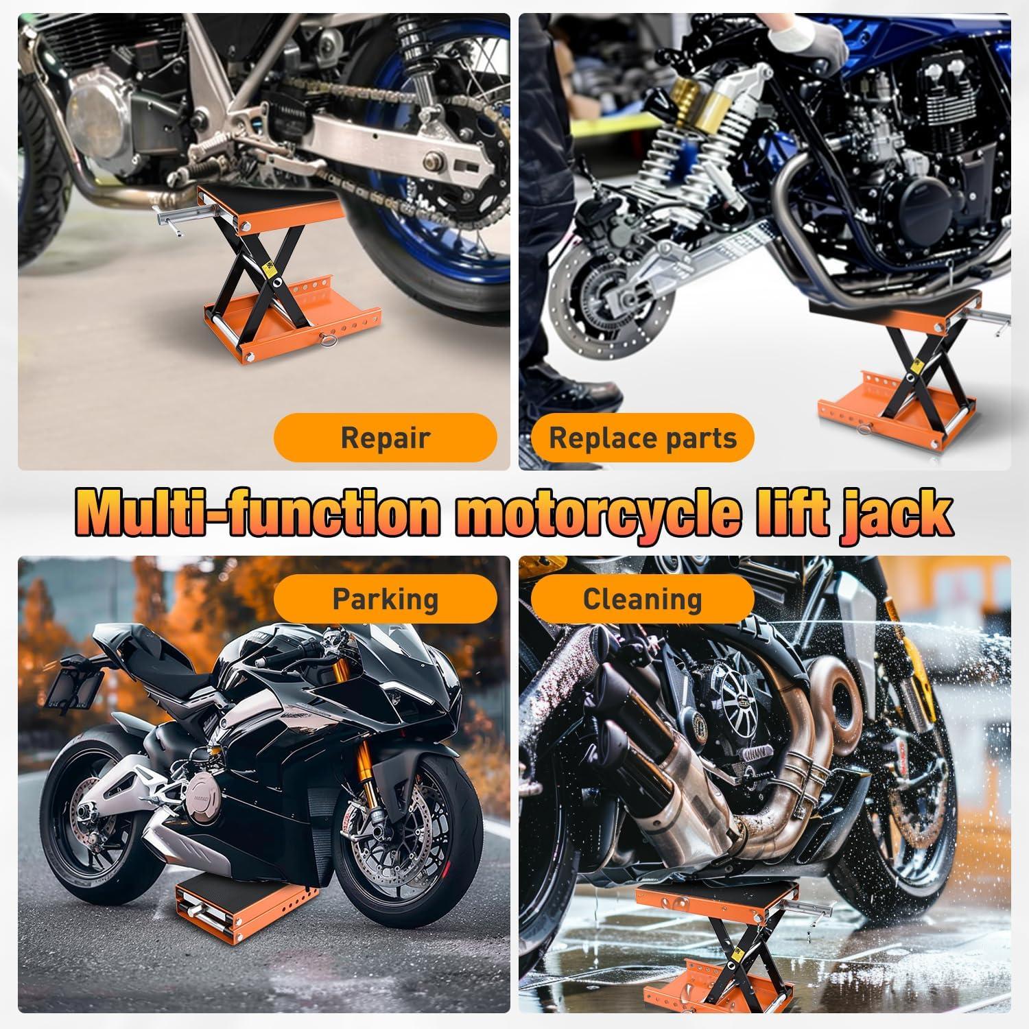 ENHANCED BEARINGS: With a one-piece steel structure at the bottom slider and a longer thicker connection between the handle and the center rotating shaft, it ensures the longevity of the motorcycle stand lift. Scissor lift jack can be used to lift various types of motorcycles, including street bikes, cruiser bikes, and adventure touring motorcycles
