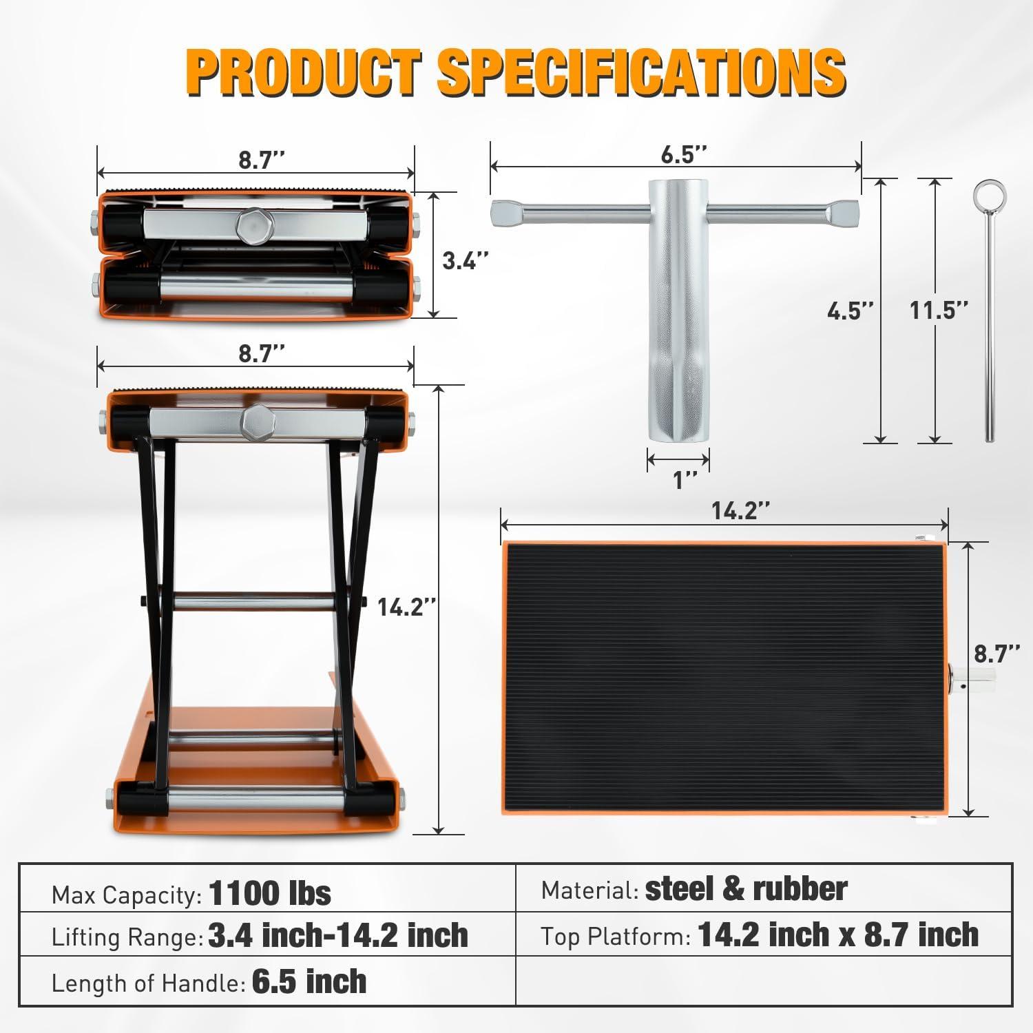 EASY TO OPERATE: Lift adjustable height ranges from 3.4 inch to 14.2 inch. With no additional tools required, motorcycle scissor lift can be easily lifted and lowered by turning the included removable crank handle to raise the bike or motorcycle to the desired height for maintenance, repair or storage. Do not use an impact wrench or powered drill to operate the lift