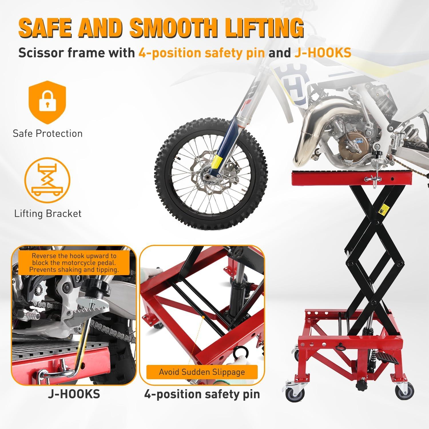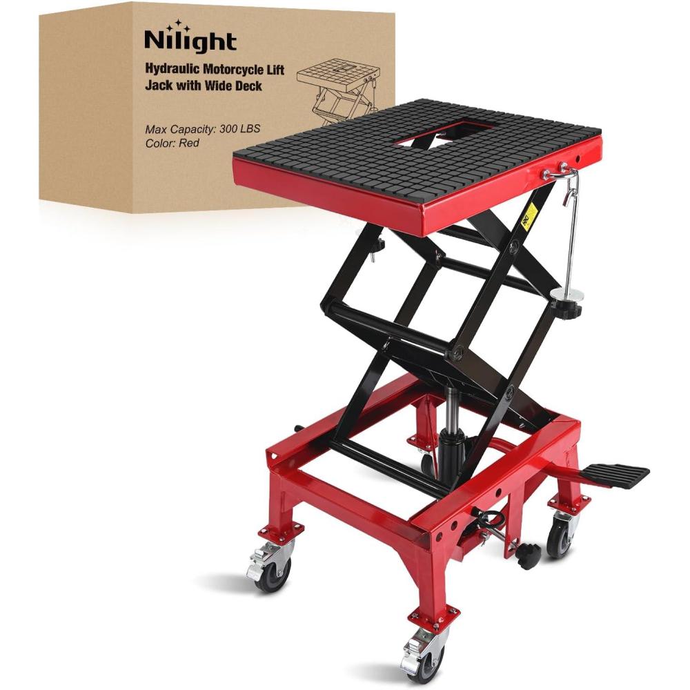 POWERFUL MOTORCYCLE LIFT: Nilight red motorcycle scissor jacks can safely handle up to 1100 lbs / 0.5 tons. This heavy duty motorcycle jack will help you lift motorcycles or dirt bikes with ease, fit for Harley Davidson and more motorcycle. Great for use in the garage, shop or track for your repair or cleaning
