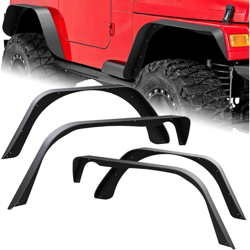 Replacement for Jeep Wrangler JK 2007-2018 Color: Textured black Materials: Heavy-Duty Black Power Coated Steel Installation: Bolt-On SPECIFICATIONS: ●1 x Set (4pcs) of Flat Fender Flares ●1 x Set of Mounting Hardware ●1 x Instruction ●More affordable compared with other brands. ●Multi protect your wheel form mud,scratches,and other outer damage ●Easy to install,no drilling required