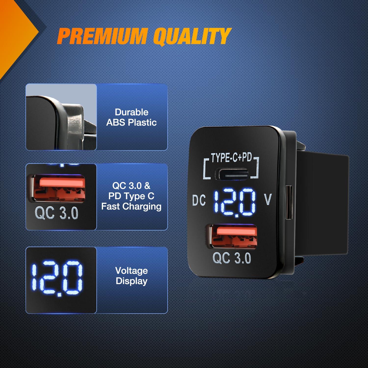 Nilight Rocker Switch Style USB Outlet Socket LED Voltmeter 12V PD Type C and QC 3 Outlets Car Using 1.28″ x 0.87″ Replacement with Inline Fuse for Sequoia Highlander Tacoma Tundra 4Runner RAVR(USB+ PD Type C)