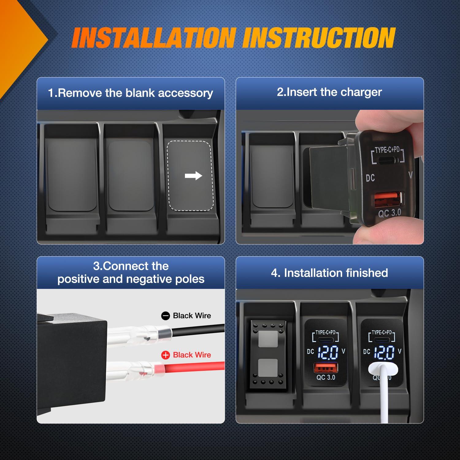 Efficient charge: Nilight Rocker Switch Style USB charger socket is equipped with 2 charging ports, which combines a type C charger and a QC3.0 USB charger ports. It provides 4x faster charging speed than conventional USB car Charger. Able to charge 2 devices simultaneously with the fast speed. Meet your quick charge demand in the case of lack of time