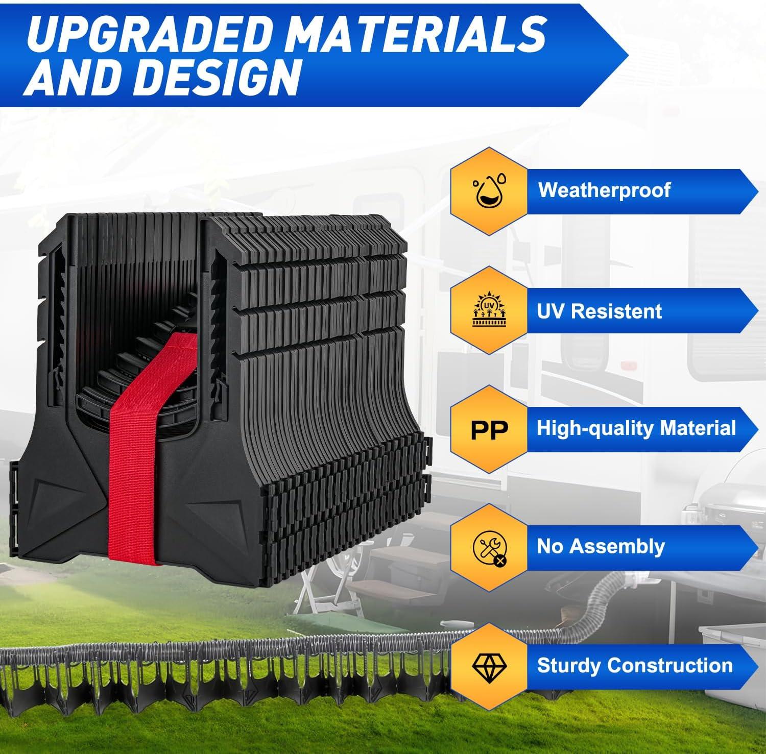 OBSTACLE AVOIDANCE & EFFECTIVE APPLICATION- The flexible foldable design allows this camping sewer hose holder to bypass obstacles precisely. It also adapts to various terrains, such as flat land, grass, sand and mud. Firmly supports the sewer hose for better drainage.