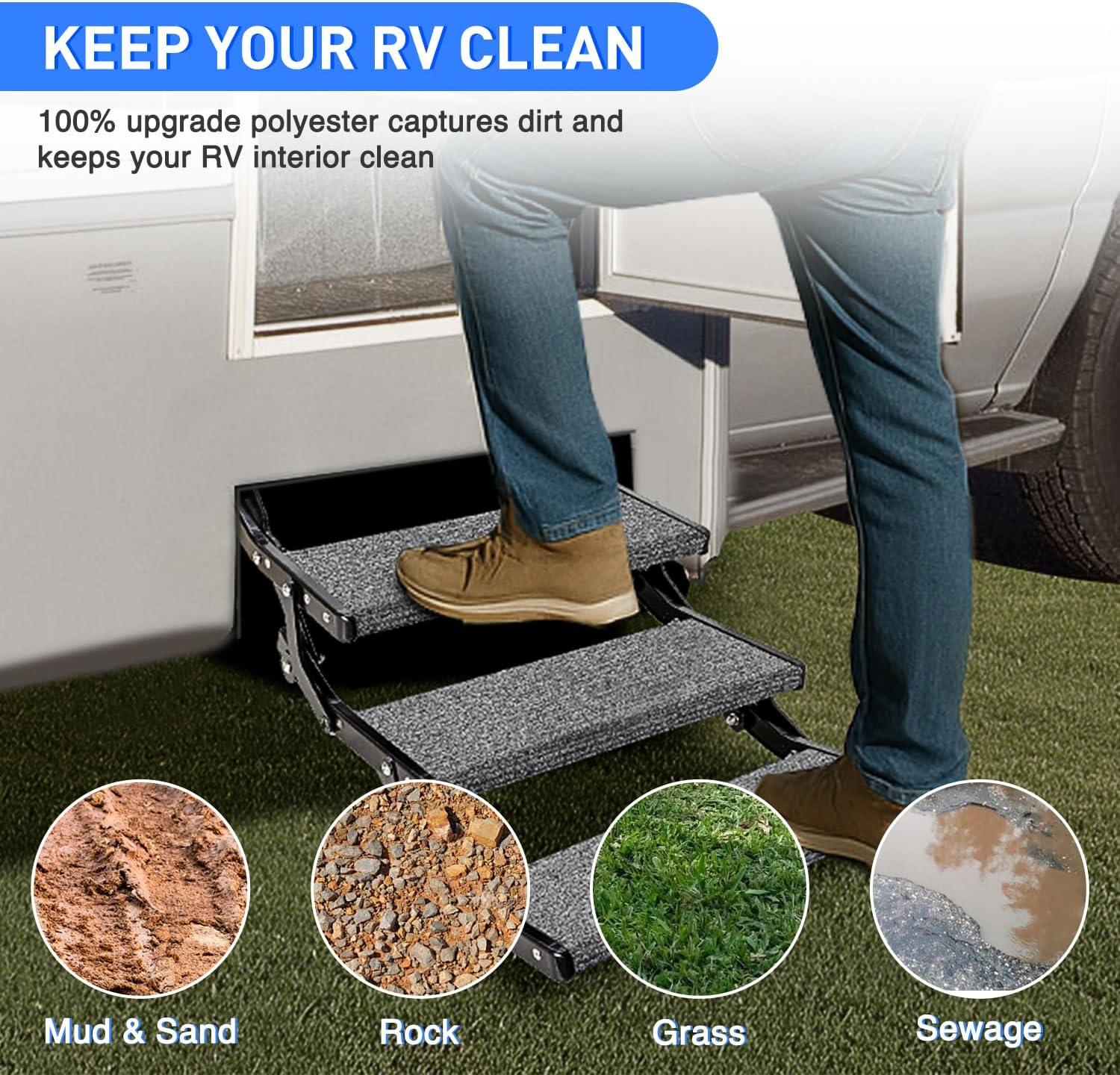 KEEP RV CLEAN & PROTECT FEET: The camper step covers crafted from high quality polyester, this RV stair carpet traps dirt to keep your RV interior clean and saves cleaning time, while protecting pets and family from hot metal surfaces and reducing slip risks for safer stepping