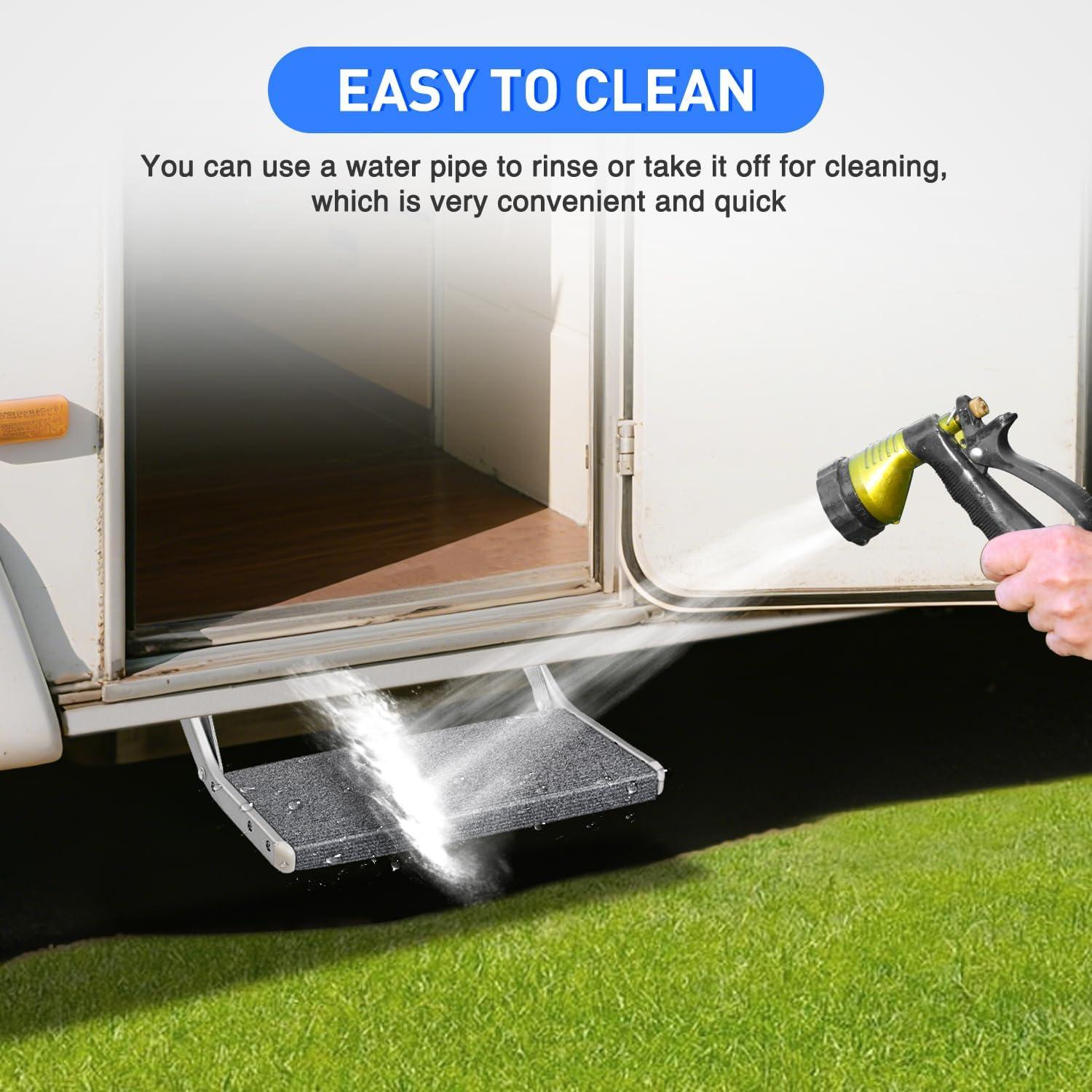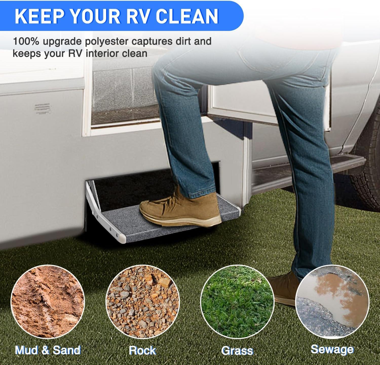 KEEP RV CLEAN & PROTECT FEET: The camper step covers crafted from high quality polyester, this RV stair carpet traps dirt to keep your RV interior clean and saves cleaning time, while protecting pets and family from hot metal surfaces and reducing slip risks for safer stepping