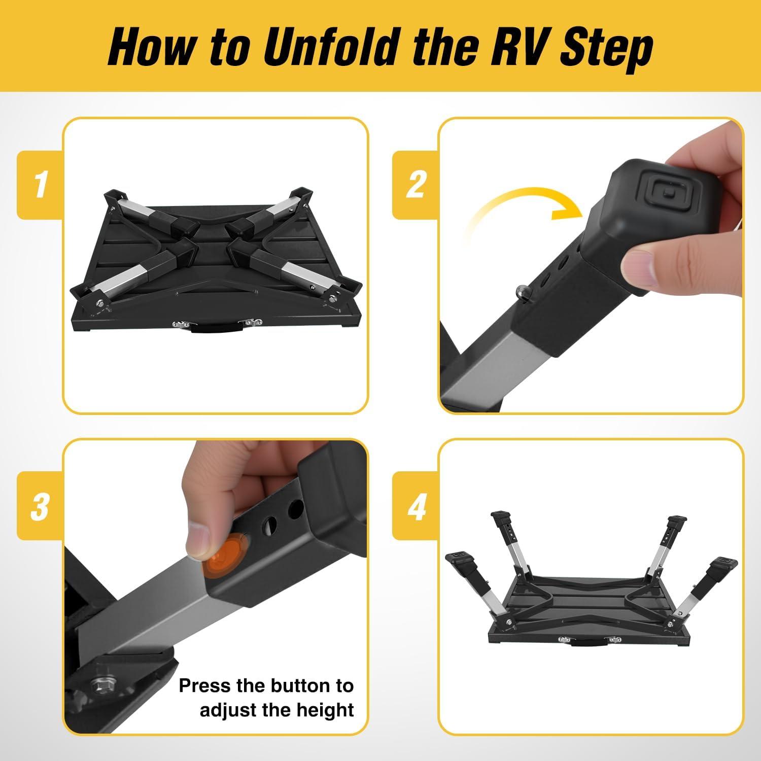 PORTABLE & EASY TO STORE: With the push of a button, you can easily fold camper trailer steps into a compact size, allowing it to fit into tight spaces without taking up too much room. Additionally, the sturdy RV step stool features a portable handle and is lightweight, making it easy to carry and use on the go.