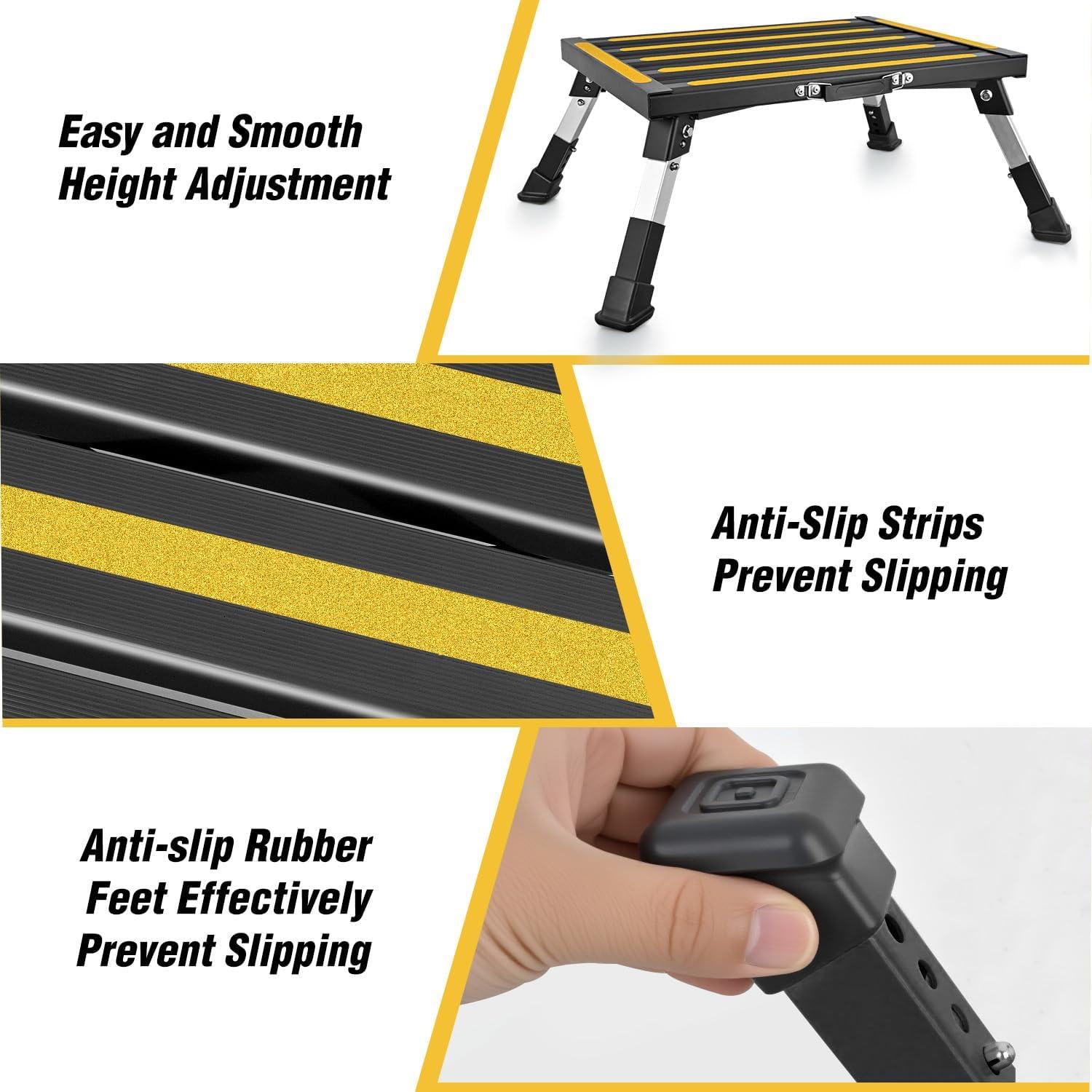 STABILITY AND NON-SLIP: RV entry steps have more than just grips for added friction. It also features non-slip rubber coverings on its legs for added stability and support. . There is a portable handle on the side for easy portability.