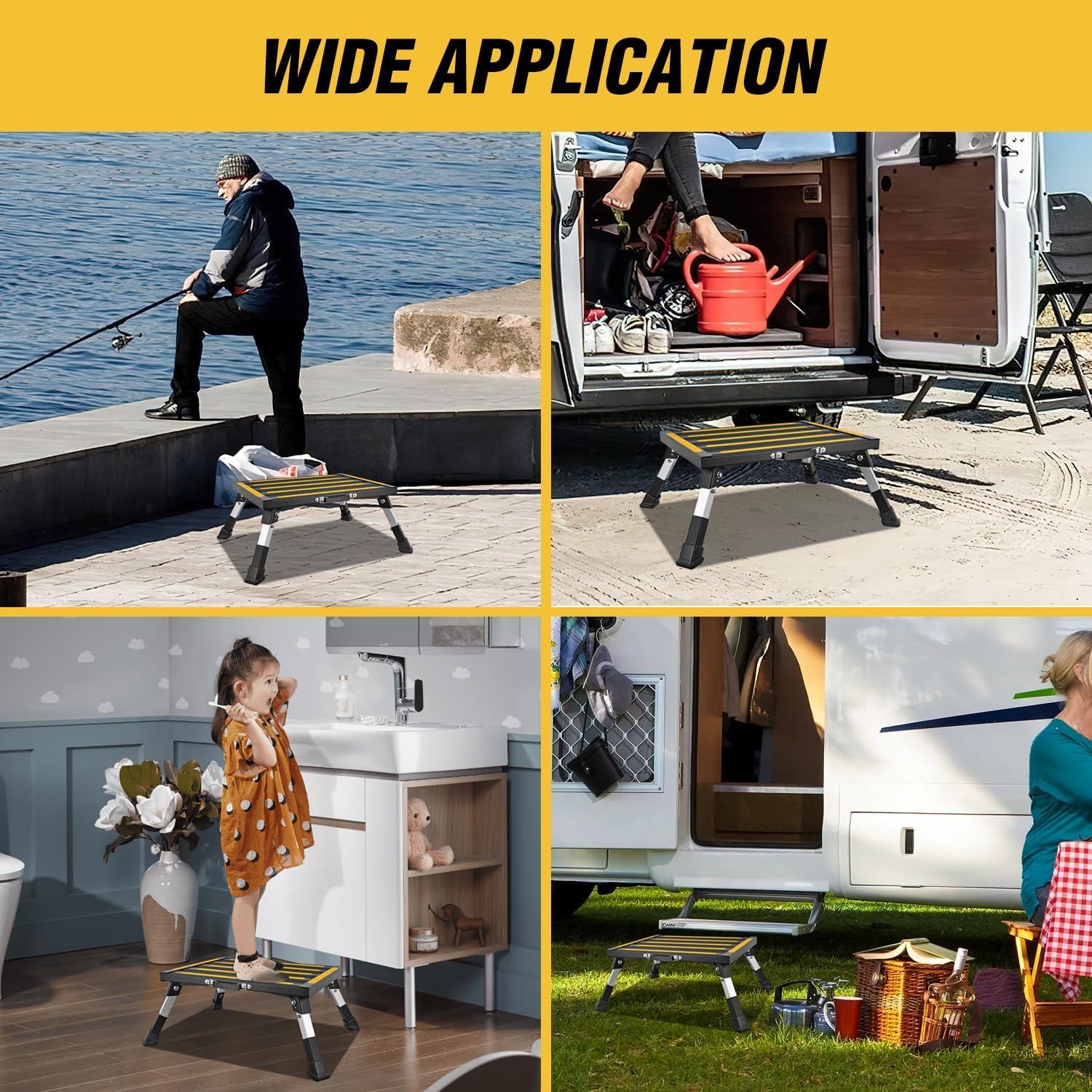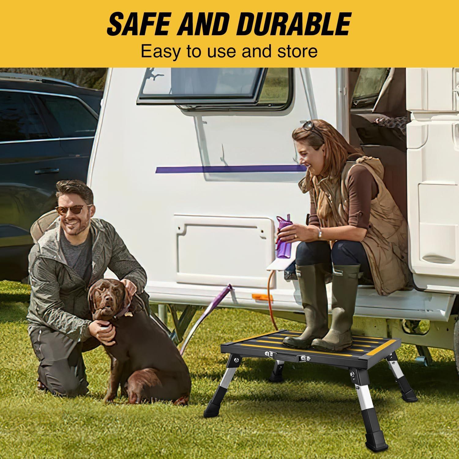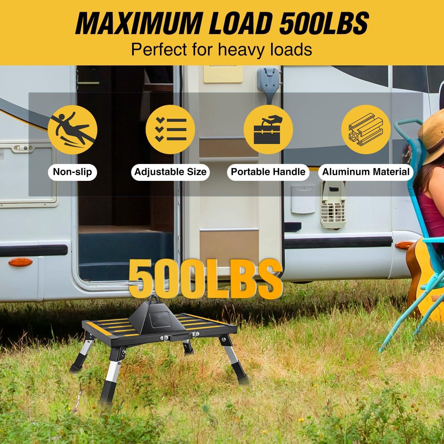 STRONGER AND DURABLE: The RV steps are made of high-strength aluminum alloy material to ensure sturdiness,durability and long service life. With a weight capacity of up to 500 pounds, the RV step stool can withstand frequent use and harsh outdoor conditions, making it an excellent investment for any RV owner.