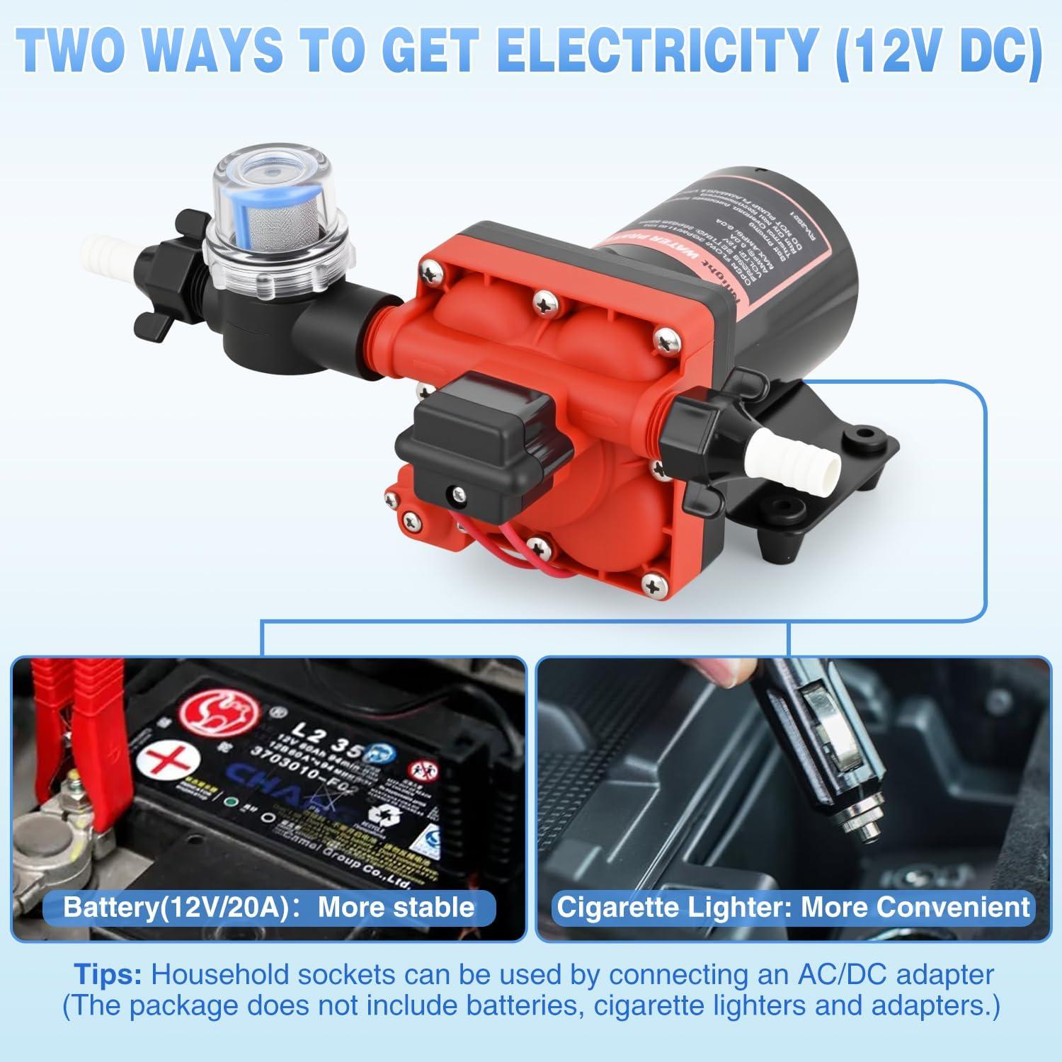 PACKAGE LIST: Includes 1 x 12v RV water pump with pressure switch, 2 x 1/2″ hose adapters, 1 x inlet filter. If you have any question, please feel free to contact us and our team is always at your service