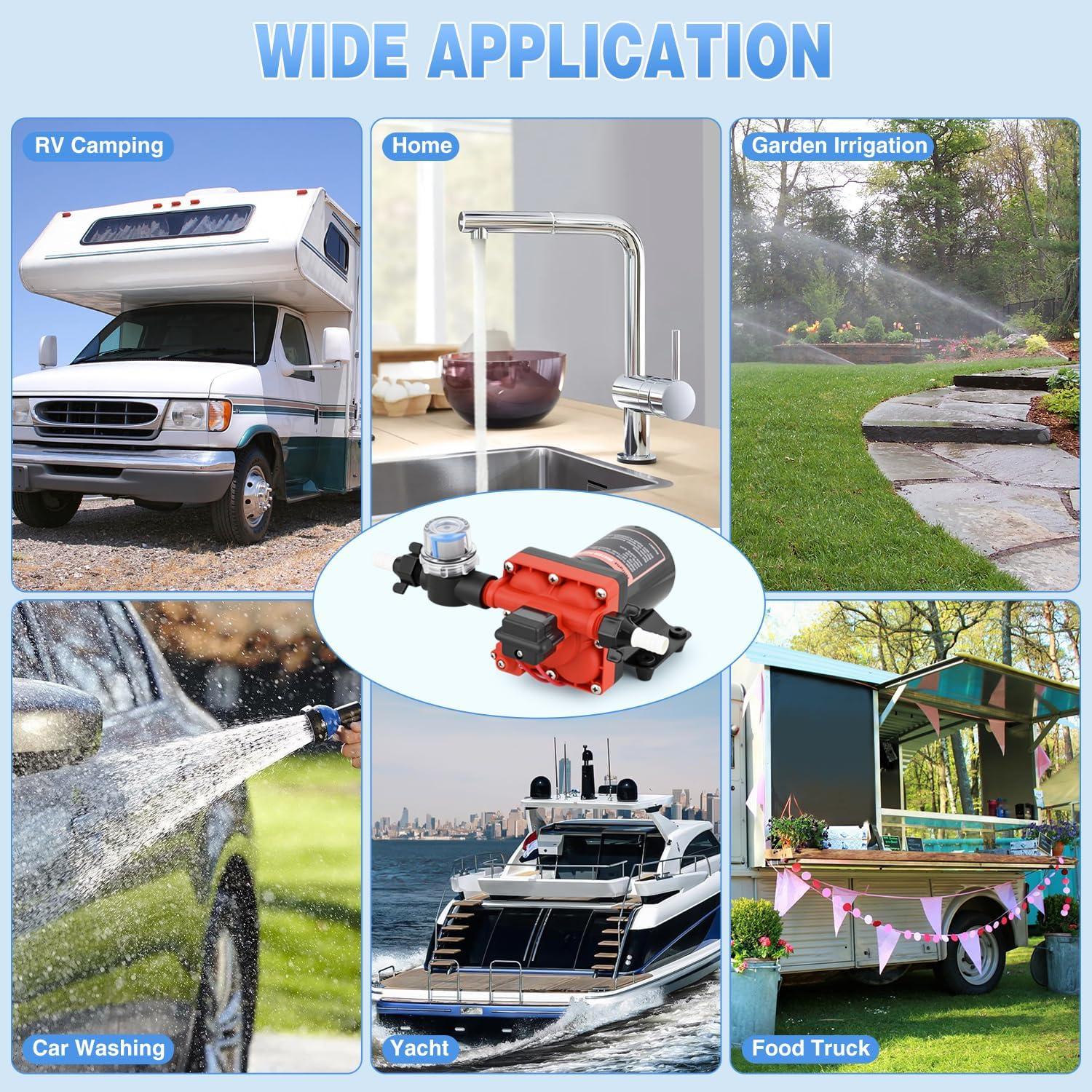 COMPATIBILITY & WIDELY USED: Featuring 1/2″ NPT inlet/outlet threads (compatible with standard hoses via included adapters), this diaphragm pump 12v excels in RV camping, yacht plumbing, home water systems, garden irrigation, car washing and food truck setups. From outdoor adventures to domestic use, it adapts seamlessly to any 12V-powered water supply need