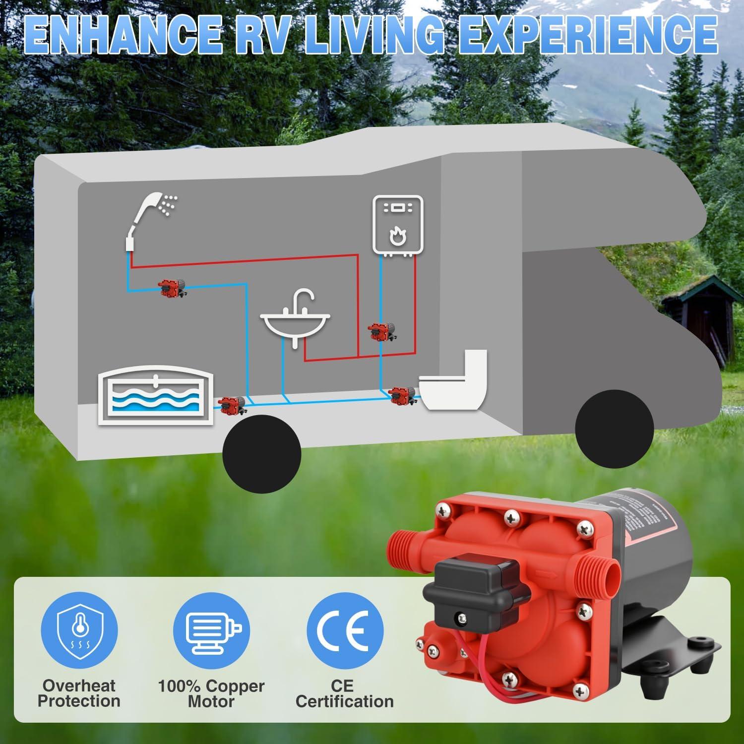 SAFE, QUIET & LONG-LASTING: The RV pump 12 volt equipped with thermal overload protection that auto-shuts off the pump to prevent overheating, extending its lifespan. The anti-slip rubber base and low-vibration design keep operation nearly silent, so even nighttime water use won’t disrupt your RV’s peaceful