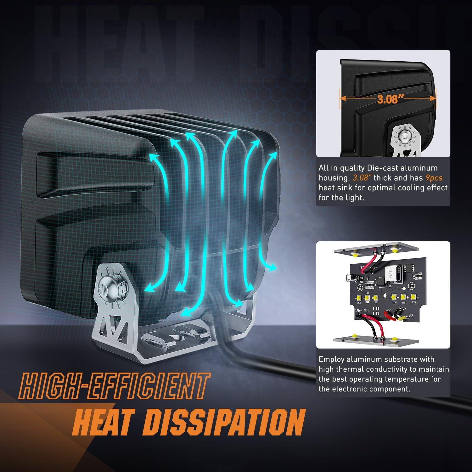 【Side Shooter Design】Designed with dual side lights to work together with front spot light. Perfectly combines spot and flood light beam, shoots out a 150°wider and 761FT further light coverage to clear darkness and potential hazard, increasing your driving safety. Works great as fog lights, side lights, ditch lights, driving lights, auxiliary lights etc
