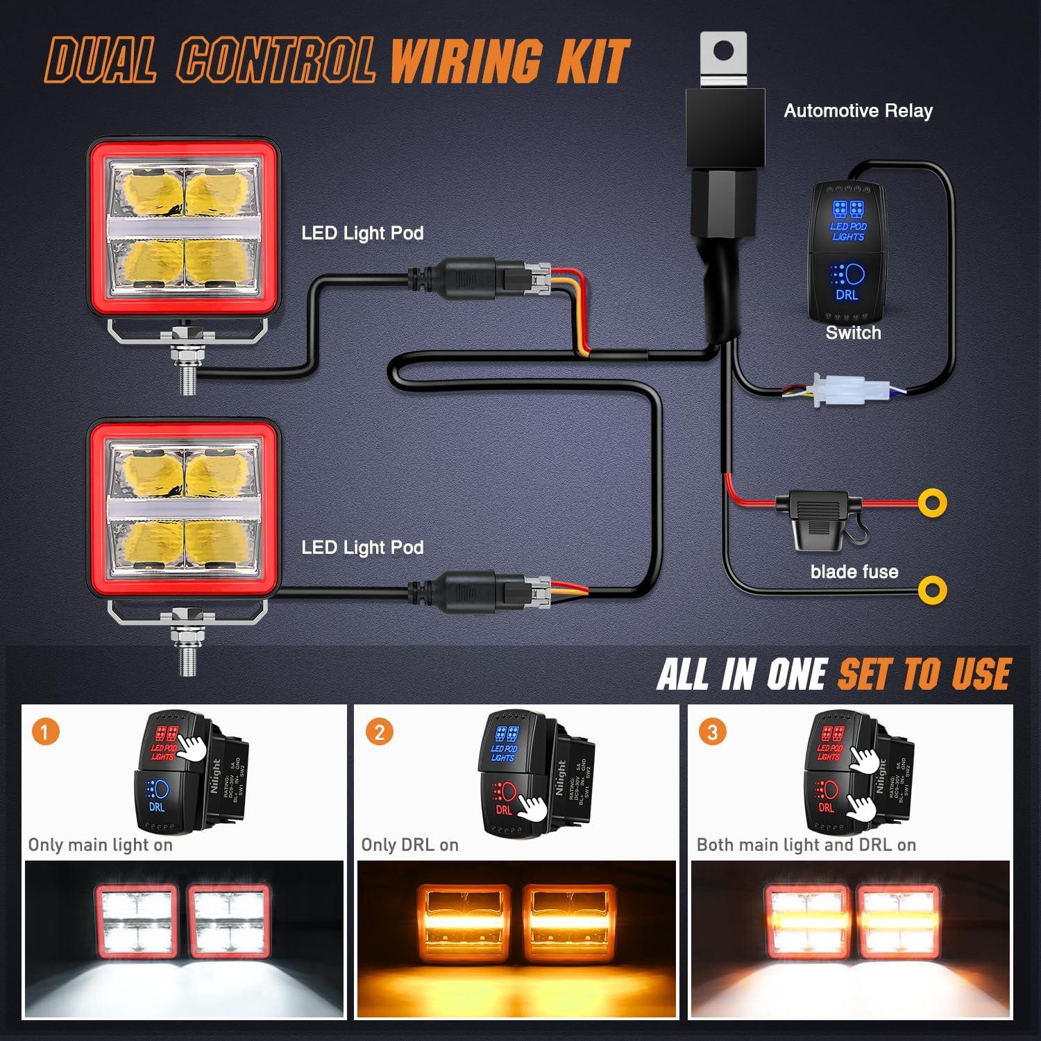 Nilight 2PCS 4 Inch Side Shooter LED Light Pods with DRL &16AWG Wiring Kit A trusted lighting option feature amazing and long lasting brightness, perfect spot flood combo beam for 150°wider and 761FT further light coverage, and additional DRL for daytime ride. Employ the best compact design- flat seal structure to enhance and ensure a trusted waterproof. Work great as fog lights, side lights, driving lights, auxiliary lights etc. Can be widely mounted on ATV, UTV, SUV, motorcycle, 4X4 offroad, truck, tractor forklift utility vehicle heavy equipment, hunting, camping, mining, marine ect Specifications: LED Chips: Osram P8, 2835 led chips LED Power: 26W/PC Raw Lumen: 2830LM/PC Effective Lumen: 2350LM/PC Lighting Performance: 540Lux@10Meters, 1Lux@232Meters(761FT) Amperage Draw: Main light: 1.93A/12V, 0.93/24V Beam Type: Spot Flood Combo Lighting Mode: Spot flood light+DRL Operating Voltage: 9-30V DC Color temperature: 5700-6000K . Operating temperature: -40~85.0 ℃ Lifespan: 50,000+ Hours Waterproof: IP67 Material: 6063 Aluminum housing, aluminum substrate circuit board,Osram led chips, PC lens Certifications: CE, FCC and RoHS Package Include: 2PCS 4 Inch Side Shooter LED Light Pods with DRL 1PC 16AWG Dual Control Wiring Harness Kit-2 Leads 1 Pack Mounting Bracket & Hardware 1 wiring Instructions