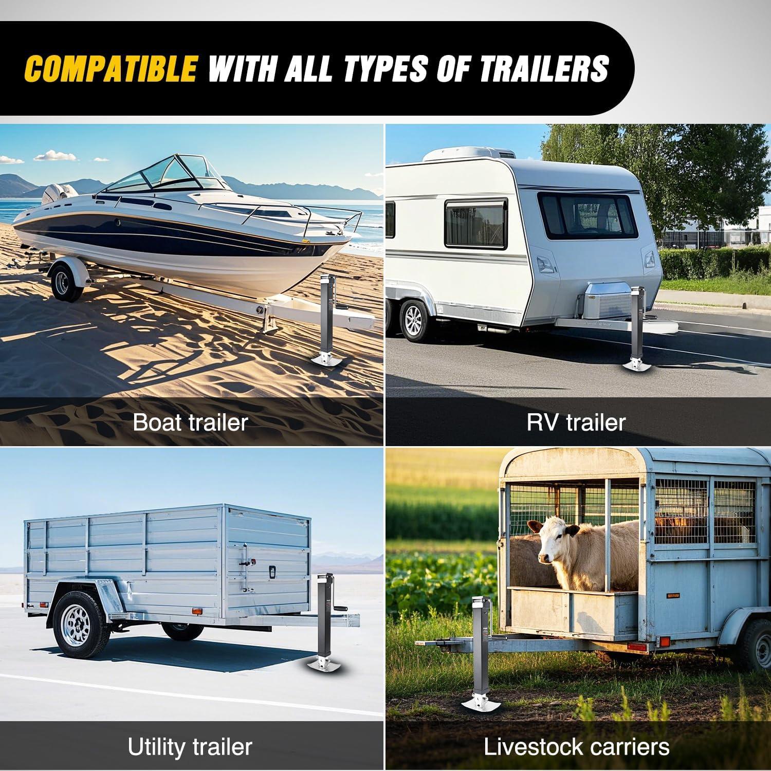 DURABLE MATERIAL: The boat trailer jack main body adopts high-strength alloy steel forming process, which can bear long-term load without deformation. The surface is specially coating with black powder to prevent rust and corrosion. The base is wide and can provide stable support