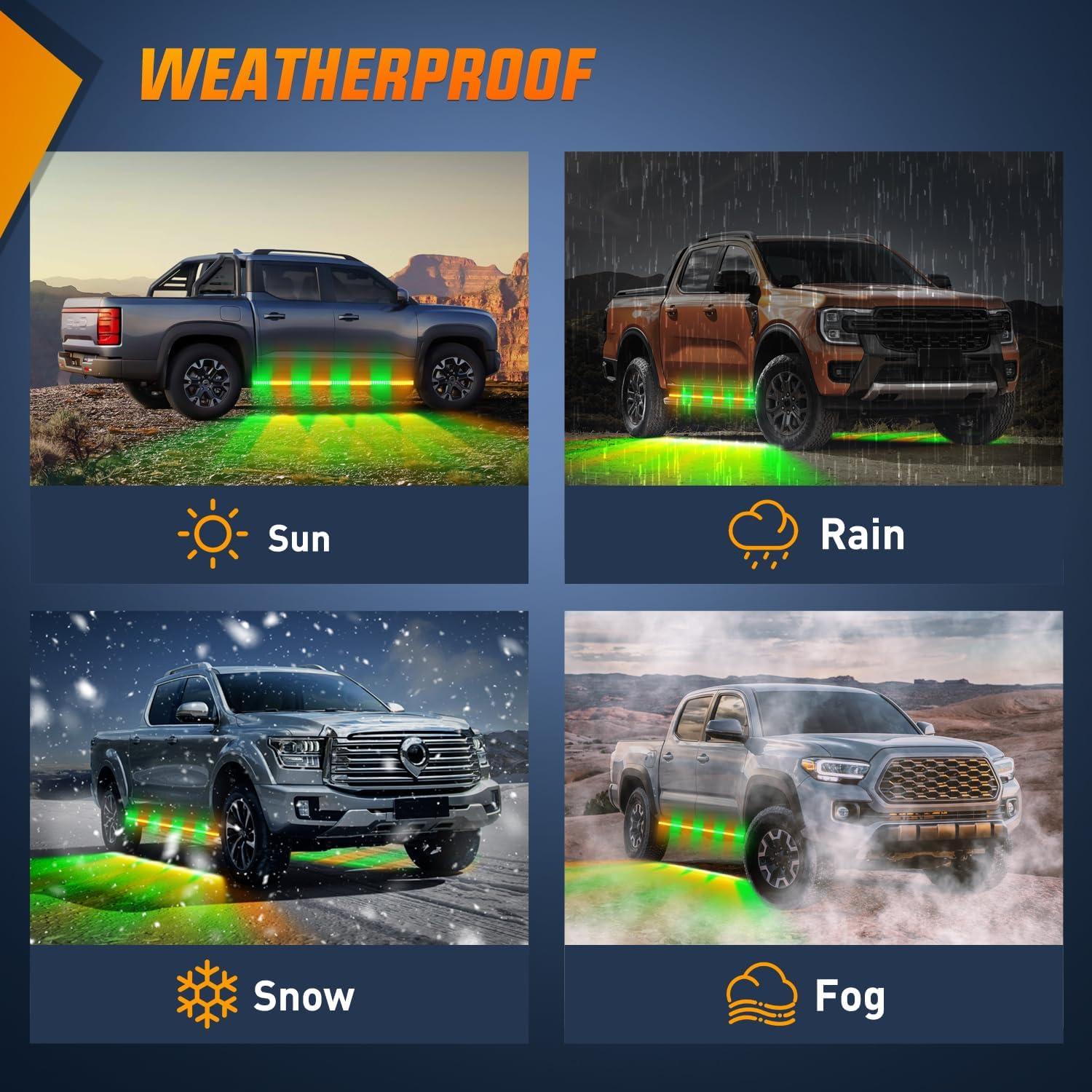 Waterproof & Durable: Different from the PVC light strip, this aluminum frame tailgate light adopts IP67 epoxy waterproof technology, which has the characteristics of water resistance, chemical corrosion resistance and crystal clear, resist any harsh weather and environment. Outlasts with a lifespan over 50, 000 hours