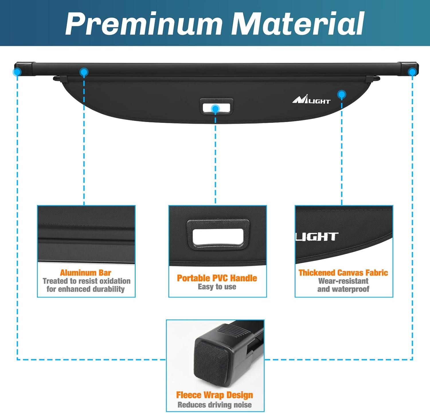 Durable Quality: Crafted from high-strength canvas, Nilight cargo cover boasts superior durability. Features with waterproof, dirt-resistant and scratch-resistant, it safeguards your cargo area with wear-resistant attributes, ensuring the long-lasting performance