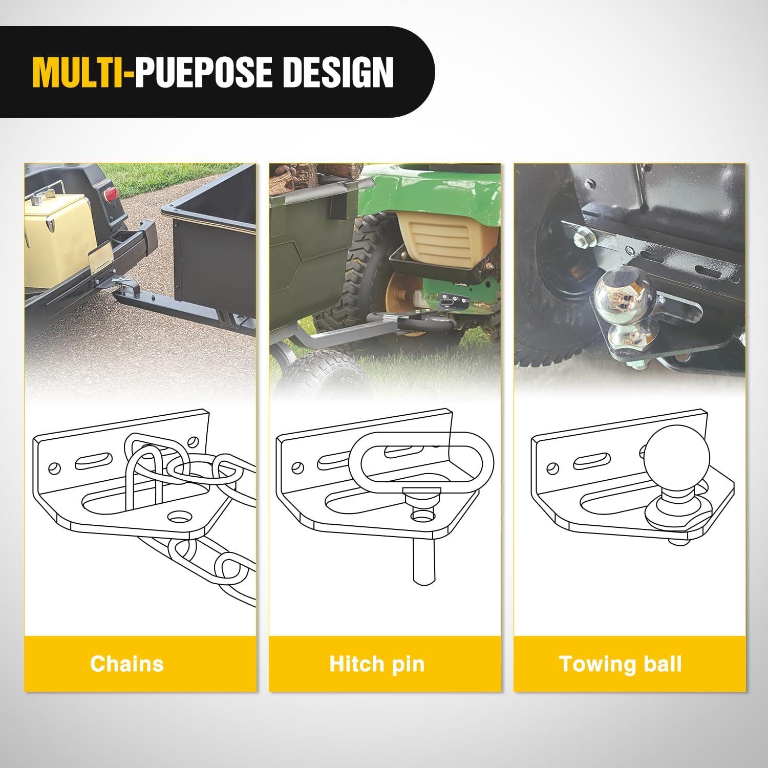 APPLICABLE – Universal designed and compatible with many models lawn mower, tractor, trailer, golf cart, ATV.The chain slot on universal lawn mower ball hitch can easily attach any straps, ropes, hooks and chains.The 3/4″ hitch pin hole on mower hitch can attach magnetic hitch pin or towing ball
