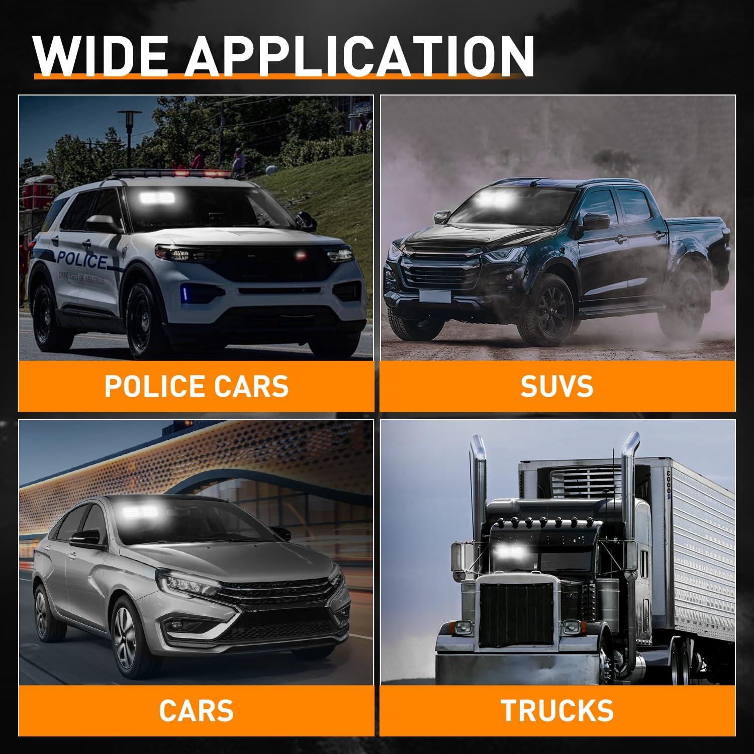 Wide Application: The strobe light is widely used in all 12V-24V vehicles including Hazard Warning, Law Enforcement, First Responder, emergency vehicles, construction vehicles, Firefighter Vehicles, trucks, vans, trailers, UTV, ATV, construction, etc.