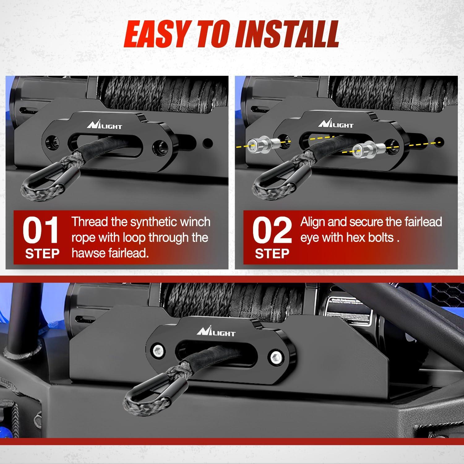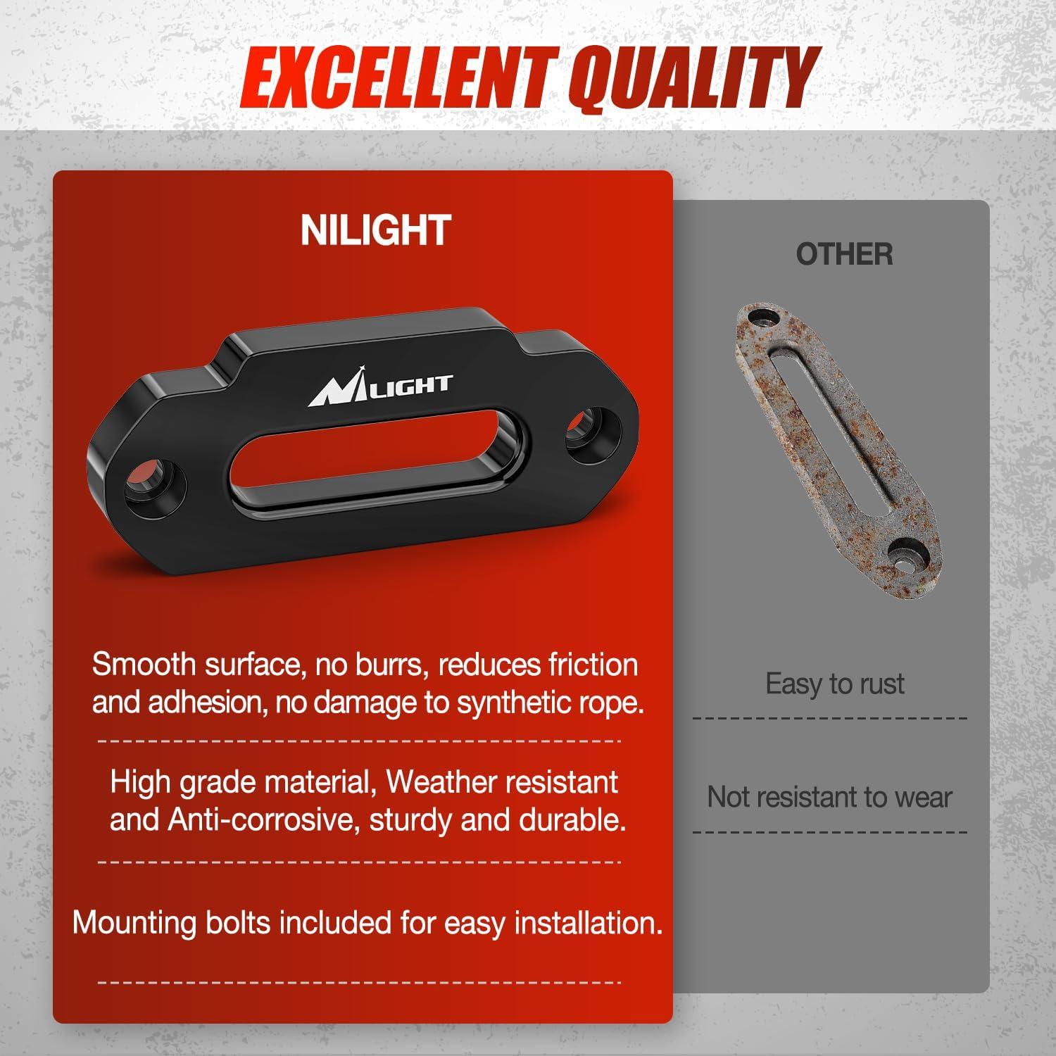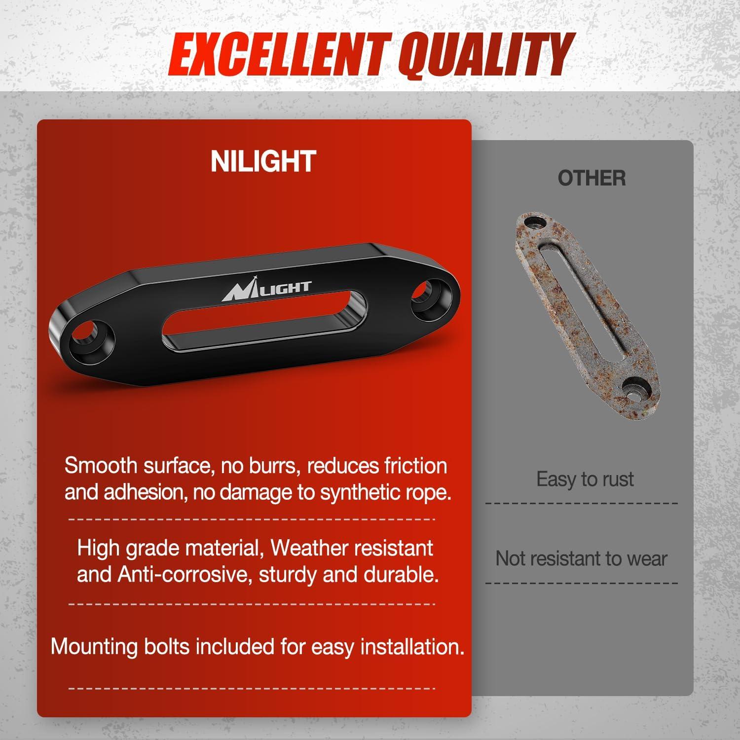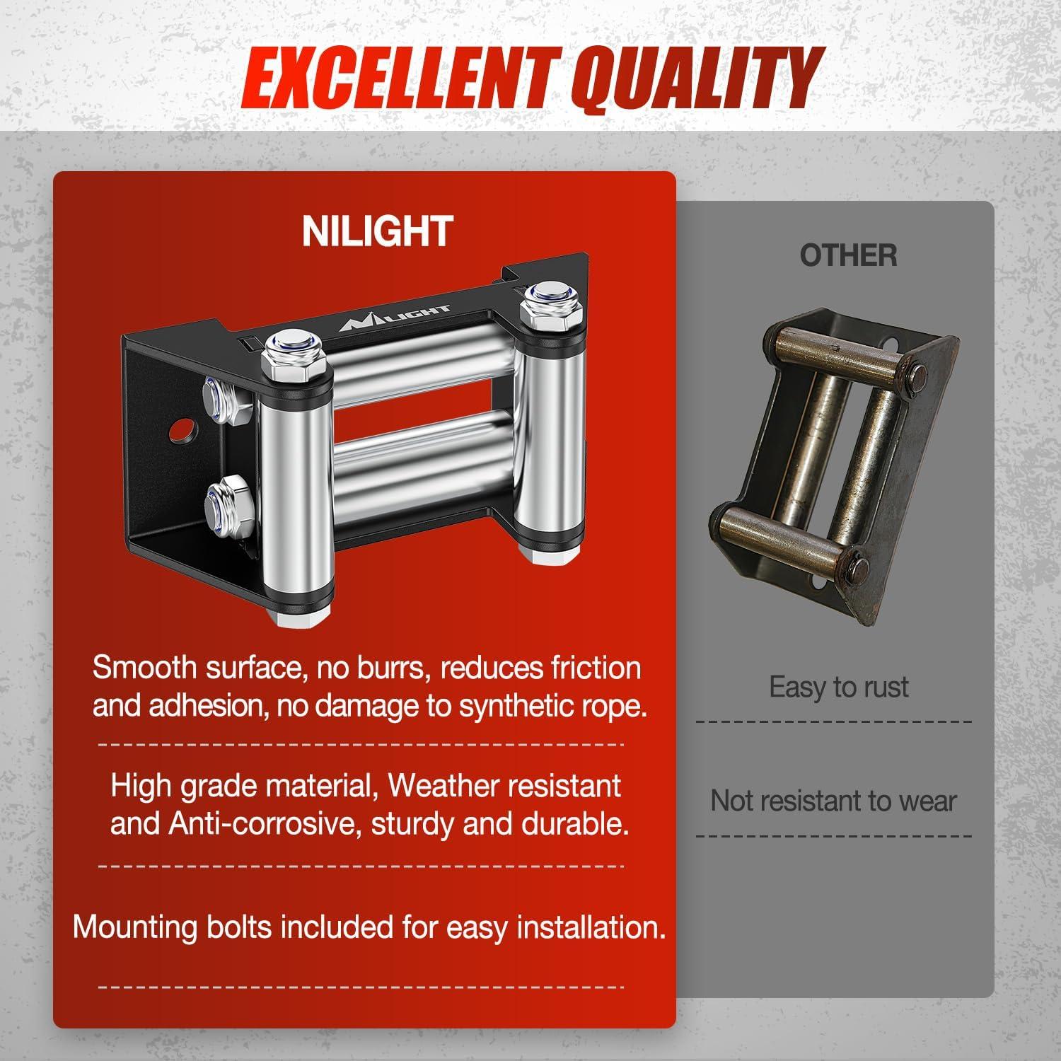 QUALITY MATERIAL FOR DURABILITY: The winch fairlead made from heavy-duty iron brackets, powder coat finish, zinc coat rollers, the bolts have a dacromet finish. Nilight winch is UV and corrosion resistant. Can be used for long periods of time on off-road adventures
